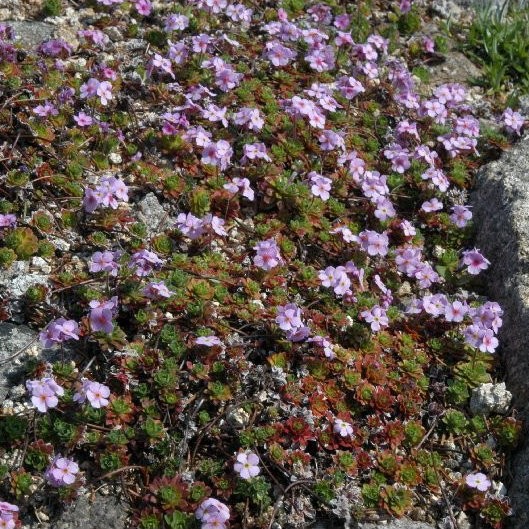 Jolie floraison de petites fleurs rose-mauve à centre jaune puis rouge. Feuillage en rosettes presque succulent. Exige des conditions de cultures typiquement montagnardes. Elle s’épanouira entre les pierres, dans un sol rigoureusement drainé.
